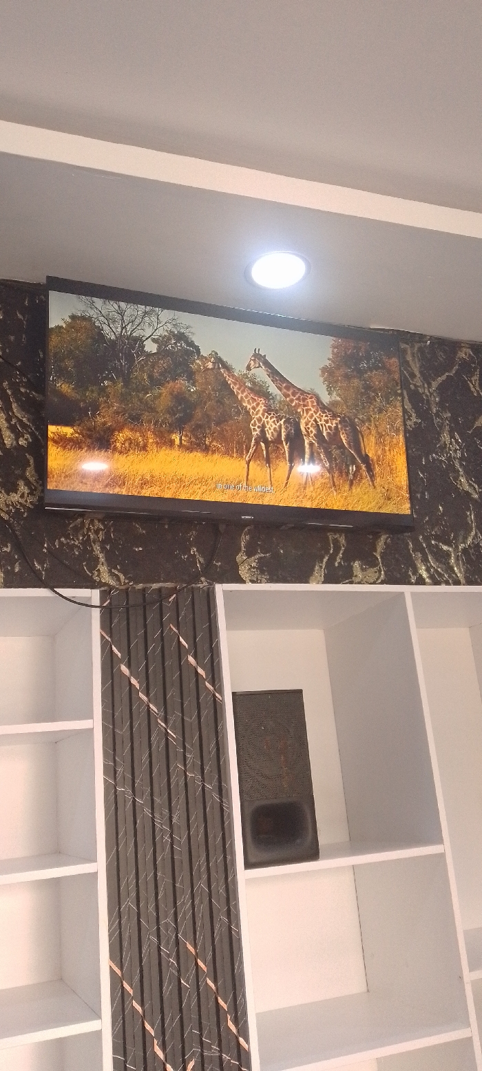The scene depicts an interior view in Matathani ward, Kenya, focused on a mounted television above a shelving unit. A flat-screen television is centrally positioned, displaying a nature documentary featuring two giraffes walking through dry, golden-brown grasslands with scattered trees under a bright sky. Partial on-screen text reads "In one of the wildest". The television is mounted against a dark, possibly black marble-patterned wall section. Above the television, a white ceiling with a single circular recessed LED light fixture is visible, emitting bright white light. Below the television is a white modular shelving unit composed of multiple open compartments. Integrated into the shelving is a vertical panel with a dark gray base and diagonal white and copper-colored linear patterns. On one of the white shelves to the right of this panel, a dark, rectangular object, consistent with a speaker or electronic device, is present. No individuals are visible.