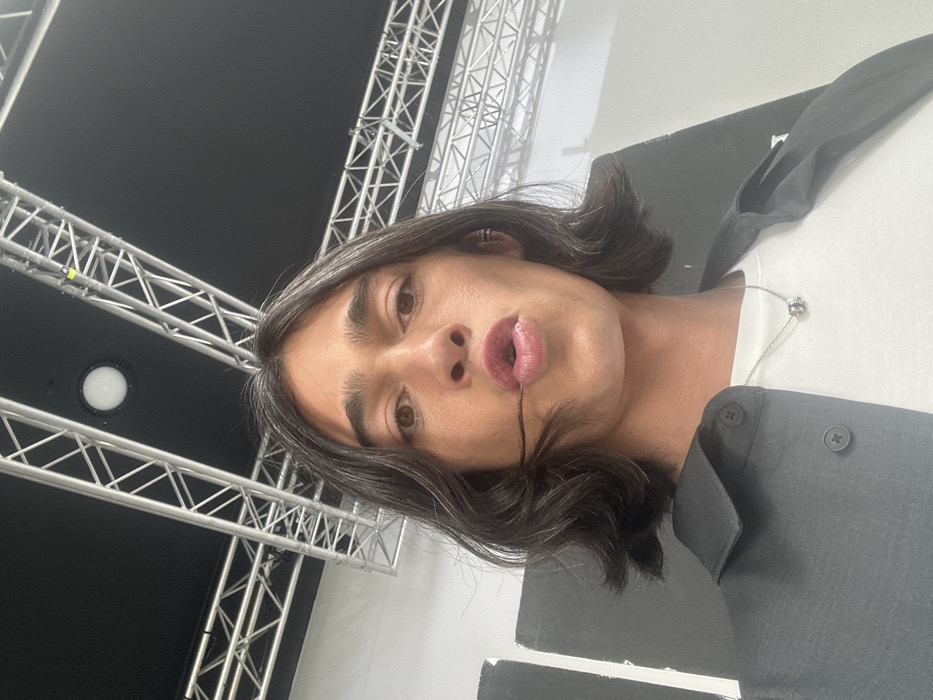 An individual, appearing to be an adult of indeterminate gender, is centered in a close-up, headshot-style image. The person has shoulder-length, dark brown, wavy hair parted down the middle. Their head is tilted slightly to the right, and they gaze directly into the camera with brown eyes. Their lips are pursed in an 'O' shape, with a single strand of dark hair caught between them, protruding towards the left. A silver ear cuff is visible on the helix of their left ear. The individual wears a white crew-neck t-shirt underneath an open, dark gray or black collared shirt. A silver chain necklace with a small, cylindrical pendant, possibly adorned with small stones, rests on their chest. The background features a high black ceiling with an exposed silver metal truss system for lighting or rigging. A circular ceiling light fixture is visible on the left side of the upper background. Portions of a white wall or screen are visible to the right and left, with a black panel or backdrop discernible on the left. The scene is observed within the city of Saint-Denis, France.