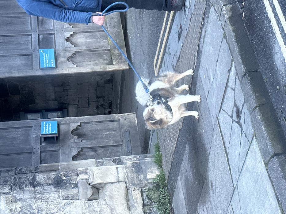 The image depicts an outdoor scene at Salisbury Cathedral in Salisbury, United Kingdom, specifically near an entrance within the cathedral close. On the right, the lower half of an individual is visible, wearing dark trousers and a blue, possibly padded, jacket. This person is holding a blue braided leash in their right hand. A small to medium-sized dog with multi-colored fur (white, brown, and grey patches) stands on a grey paved sidewalk. The dog wears a dark harness and is attached to the blue leash held by the individual. It faces left, with its head slightly turned towards the right, appearing alert. In the background, two tall, aged wooden doors with paneling and subtle gothic-style carvings are slightly ajar, revealing a darker interior. On the left door, a blue rectangular sign with white text is affixed, stating, "Please ensure the Doors are closed by 7:00 when these gates will be locked." On the right door, another blue sign with white text reads, "Salisbury Cathedral and Magna Carta" with an upward-pointing arrow and additional symbols. To the far left, a textured grey stone wall is visible. The ground consists of grey paving slabs, with a section of tactile paving behind the dog. A dark asphalt road surface is visible in the foreground, separated from the pavement by a kerb. Two faded yellow lines are marked on the asphalt. Small patches of green vegetation are present between the stone wall and the sidewalk. The pavement appears to have damp patches.