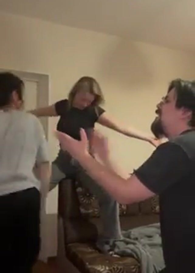 Three people are indoors, dancing and moving their arms up and out to the sides. A woman with long wavy blonde hair is sitting on the arm of a brown and gold patterned sofa. She is wearing a black crop top and gray jeans. To her left stands a woman with dark hair in a ponytail wearing a gray long-sleeved top and black leggings. To the blonde woman's right is a man with a beard, wearing a black t-shirt. He is clapping. The room is small with cream-colored walls and a white door to the left.
