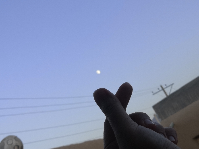 The image depicts an outdoor twilight scene in the city of Unknown, Unknown. A human hand, silhouetted in the foreground, performs a Korean finger heart gesture by crossing the thumb over the index finger. In the upper-left portion of the clear blue sky, a distinct white, circular celestial object, consistent with the moon or a bright planet, is visible. Multiple dark horizontal lines, identified as overhead power lines, span the midground. To the right of the hand, a utility pole with crossarms and insulators is partially visible, standing alongside a light-colored building wall or roofline. In the lower-left, a portion of a grey, curved object, possibly a satellite dish or dome-shaped structure, is present. The sky transitions from a lighter blue at the horizon to a deeper blue overhead, indicating either dawn or dusk.