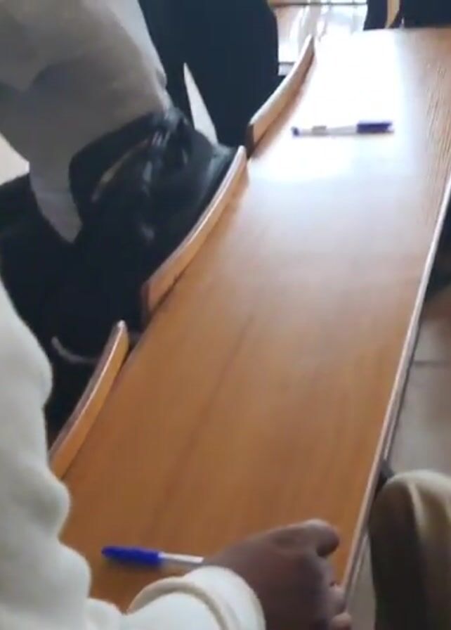 Several people are in a room, likely a classroom. A row of wooden desks with attached seats runs through the scene. A black backpack sits on a seat behind one desk. On the surface of the desk in the foreground, a blue pen rests. Someone throws a small white piece of paper across the desk. A person wearing a white long-sleeved shirt and tan pants sits at the desk, facing forward. Another person stands behind the desks, wearing dark pants and brown footwear.