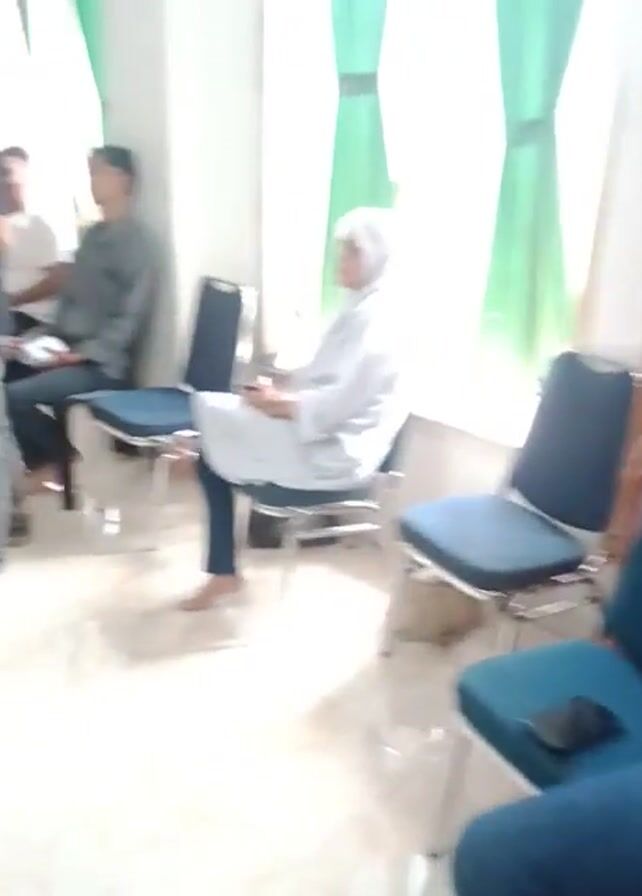A short video shows a group of people in a room. One person sits in a blue chair wearing a white headscarf. Several men stand in the room. One man wears a light blue patterned shirt, black pants, and no shoes. Another man wears a brown shirt and jeans. The room has white walls and tile floors. There is a window with green curtains. A wooden cabinet stands against one wall.