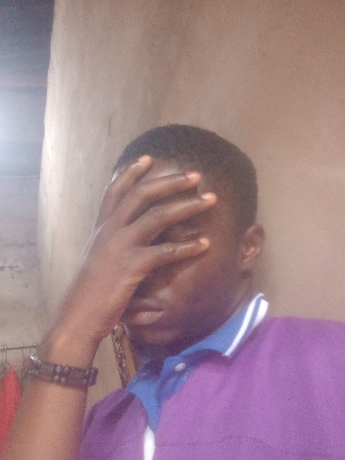 An adult male subject is depicted indoors in Ogidi, Nigeria. He is positioned facing forward, with his right hand placed across his face, covering his eyes and the bridge of his nose. The subject has dark skin and short, dark hair. He is wearing a purple collared shirt with a blue inner collar and a white stripe detail along the edge of the collar, secured by at least one white button. A dark-colored, multi-strand bracelet is present on his left wrist. The background consists of light-colored, possibly beige or light brown, walls; a slightly textured wall is visible on the left, and a smoother wall on the right. A dark rail with what appears to be a red garment hanging from it is partially visible in the far left background.