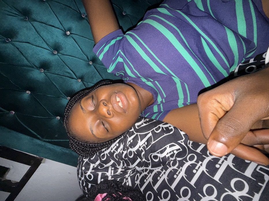 A person with dark skin and braided hair is lying on a green tufted couch. They wear a purple shirt with green stripes. Their eyes are closed, and mouth is slightly open, revealing some teeth. Part of a hand is visible in the right side of the frame, resting on the person's clothes. The clothes and pillow beneath them have a black and white patterned design. The person's face is tilted towards the camera.