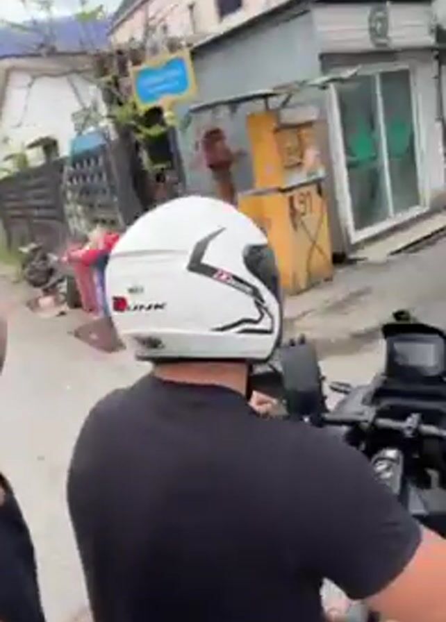 A man in a black tank top and backpack walks along a street, filming himself. He appears to be in Thailand, as there are shops with marijuana leaf signage. He gets on a motorcycle and drives away, through traffic. The street is congested, with overhead electrical lines.