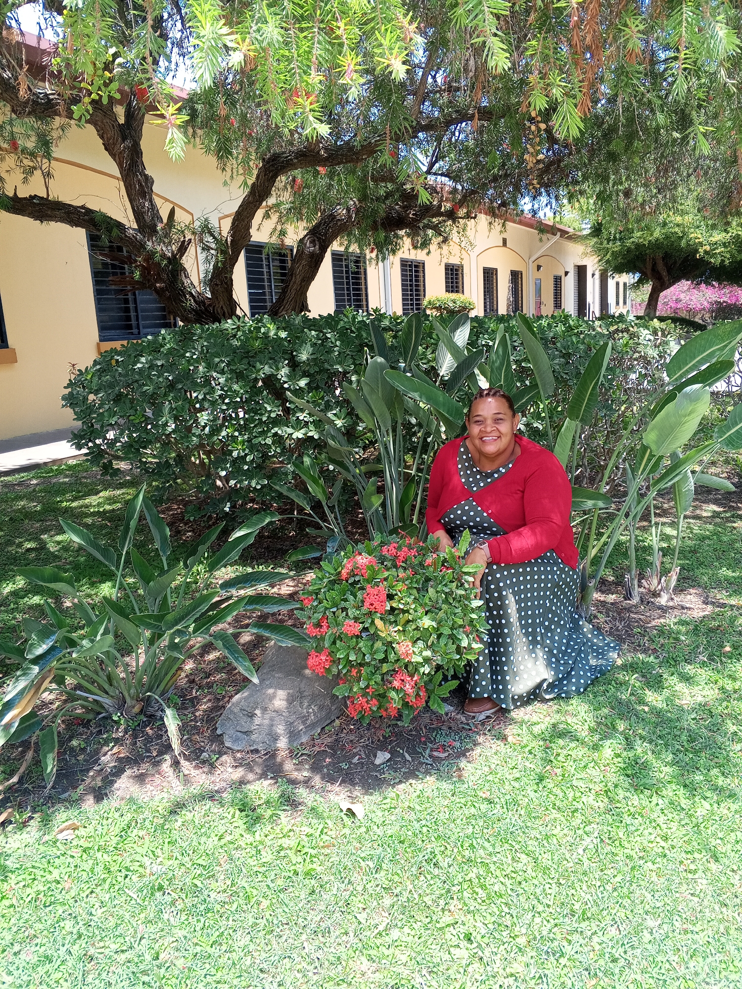 A woman is crouching in a garden setting. She is wearing a red cardigan over a green dress with white polka dots and brown shoes. She is positioned in front of a flowering bush with small red flowers. Behind her is a mix of greenery, including leafy bushes and tall, broad-leaved plants. A large rock is visible near the flowering bush. The setting appears to be well-maintained, with a manicured lawn visible in the foreground. In the background, there is a light yellow building with dark-framed windows and a large tree with red-tinged leaves hanging over it. Based on the image's provenance, the location is likely La Victoria, Venezuela.