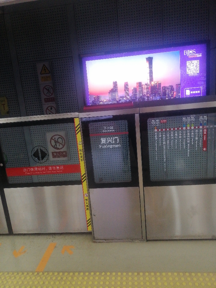 The image depicts a static scene within an underground subway station platform, specifically at Fuxingmen Station in Xicheng District, Beijing, China