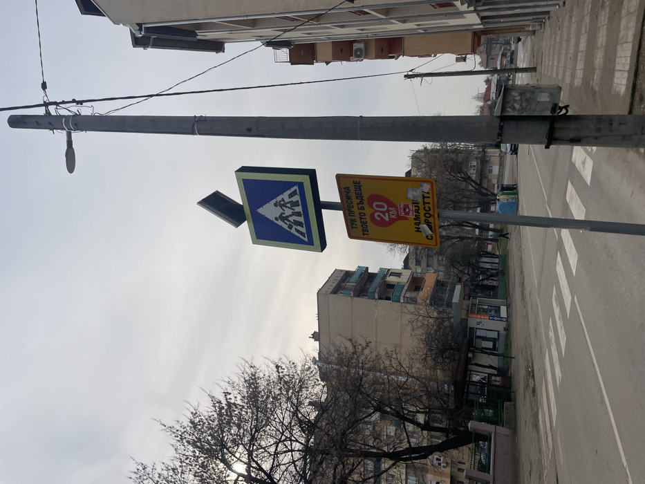 This image presents an urban street scene in Vidin, Bulgaria, under an overcast, light grey sky. The scene is likely daytime during winter or early spring, indicated by the bare branches of deciduous trees. In the immediate foreground, a multi-lane asphalt road features a distinct white-striped pedestrian zebra crossing extending horizontally across the frame. On the right side of the road, a grey utility pole supports a street light fixture facing left, multiple electrical wires, and a lower-mounted metal junction box. To the left of this utility pole, closer to the road's center, a grey signpost stands. It displays two signs: an upper square blue sign with a light green border, depicting a white pedestrian crossing symbol of an adult and child, surmounted by a small, angled black solar panel. Below this is a yellow rectangular sign with a prominent red heart icon containing "20 KM" in white text, and Cyrillic text below that, which translates to "HERE CROSSES YOUR FUTURE REDUCE SPEED," partially obscured by minor damage. On the left side of the street, beyond the zebra crossing, a sidewalk is visible, bordered by a series of bare-branched trees. Behind these trees, a multi-story residential building with light-colored walls and numerous balconies is present. Further down the street on the left, a small kiosk marked "FOTO" and blue and green refuse bins are discernible. A single human figure is observed walking away from the camera on the far left sidewalk in the distance. On the right side of the street, a concrete sidewalk runs parallel to the road, adjacent to a multi-story building featuring a light beige/orange facade and multiple externally mounted air conditioning units. A dark-colored vehicle is visible further down the street on the right. The background on both sides consists of additional urban buildings. The sun's position is indicated by a bright spot visible through the bare tree branches on the upper left, partially obscured by the overcast conditions.