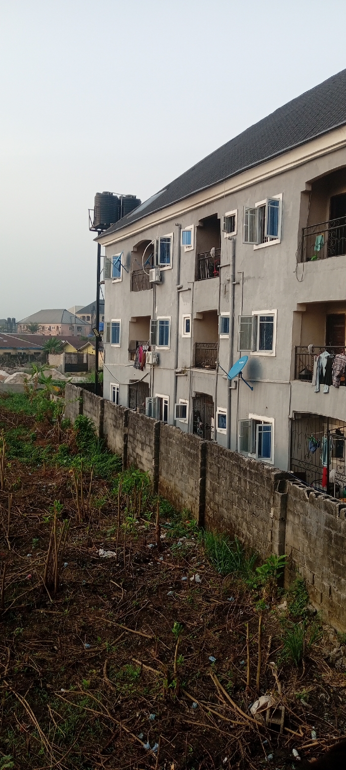 The image depicts a residential scene in Eziobodo, Nigeria, dominated by a four-story, grey-painted apartment building under a hazy, bright sky