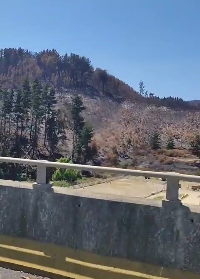 roadside view of a hillside forest that has been damaged by fire. Some trees on the edge of the hill are still green, but the rest of the hill is covered in burnt vegetation and dead trees. The camera is positioned on a bridge, with a concrete barrier and metal railing in the foreground. A road is visible below the bridge. The sky is clear and blue.