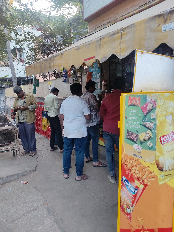 This image depicts a daytime street scene in Bengaluru, India, outside a small shop