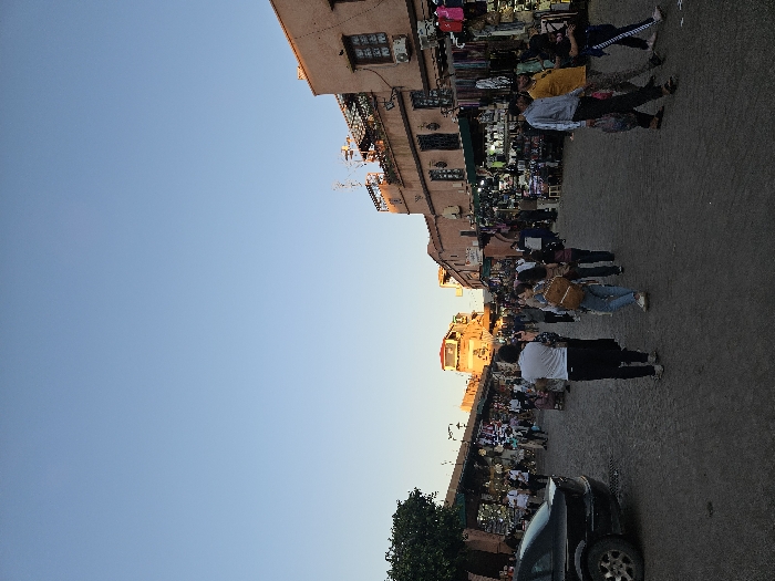 A bustling street scene unfolds under a clear sky. Buildings line the left, housing shops and vendors, their goods on display. People stroll along the pavement, their backs to the camera. A car is parked near the right foreground, its dark color contrasting with the light pavement. The scene captures the lively atmosphere of an outdoor marketplace.