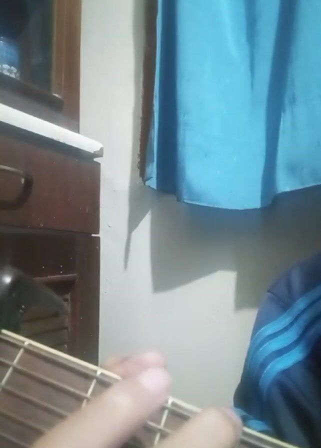 A close-up shot shows a person's left hand on the fretboard of an acoustic guitar. The fingers are positioned as if preparing to play a chord. The guitar's neck is brown, with silver frets and strings. In the background, a dark brown wooden dresser with drawers is partially visible to the left. A blue curtain hangs next to the dresser, obscuring part of a wall that looks off-white. The person's arm, wearing a blue tracksuit with white stripes, is slightly visible on the right side of the frame.