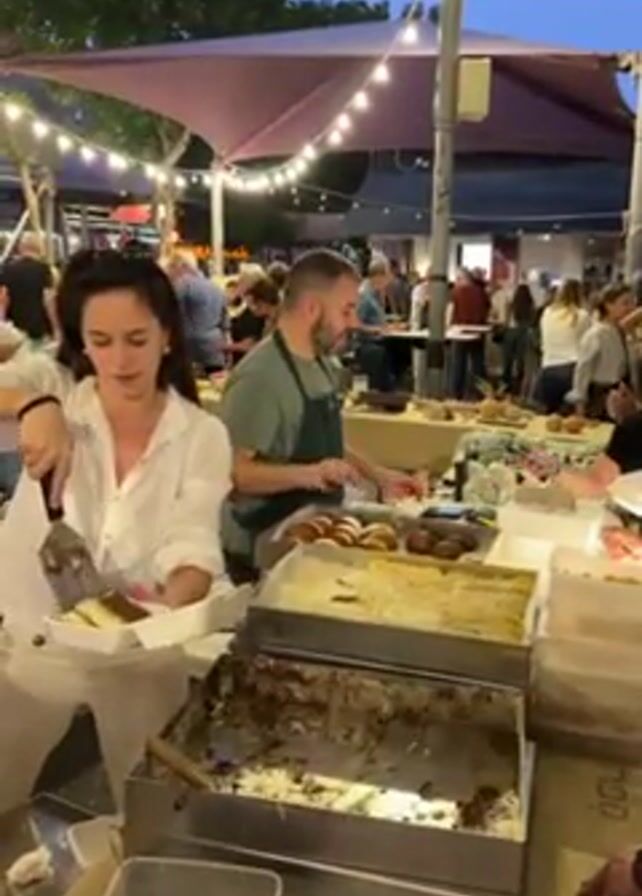 street food vendor at night with people ordering food. A woman wearing a white shirt and pants is using a spatula to put a piece of cake into a white foam box. Behind her, a man in a green apron is serving what appear to be fried pastries. There are other food trays on the table in front of them, including one that looks almost empty. Behind the vendors, other people are standing, sitting, and milling around at tables. Overhead are purple awnings and strings of lights.