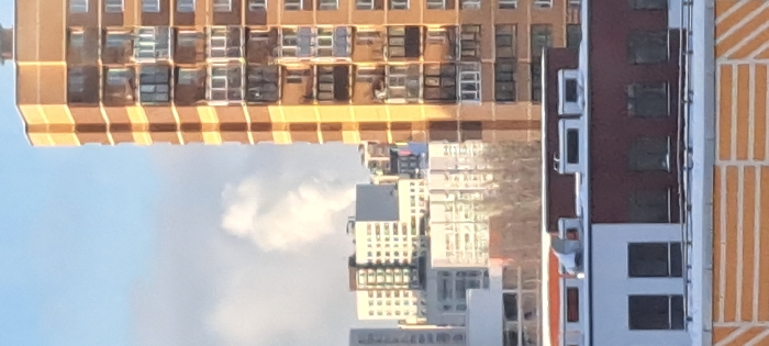 An abstract cityscape features buildings under a blue sky with a light cloud. The buildings are various heights and colors, with some appearing gold and brown, while others are white and gray. A building with brown and white accents stands out. The image is oddly angled, making the orientation unconventional.