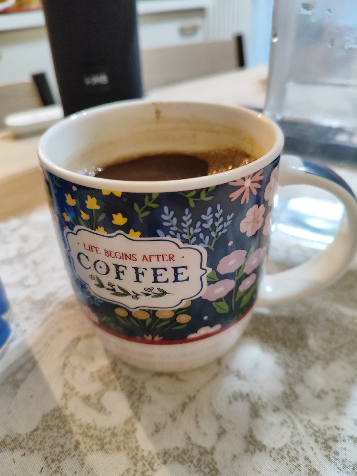 - "A ceramic mug, dark blue with a floral pattern of pink, yellow, and light blue flowers and foliage, stands prominently on a light-colored, textured tablecloth" by FM-ZLcQC3, licensed under CC BY 4.0