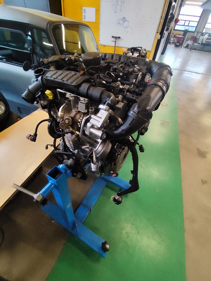 The image presents an interior view of an automotive workshop or technical training facility located in an unknown city. A disassembled vehicle engine, primarily composed of metallic and black components including a turbocharger, intake manifold, and various wiring harnesses, is centrally mounted on a blue metal engine stand. The engine stand features a horizontal support arm connected to a V-shaped base. To the left of the engine, the upper front section of a dark grey compact car is partially visible, indicating a repair or maintenance bay. The background includes a solid yellow wall, a white board displaying faint handwritten circular diagrams and text, and a further, well-lit workshop area visible through an opening. The floor is divided into a vibrant green painted section in the immediate foreground and a lighter beige/concrete area beyond. No individuals are present in the scene.
