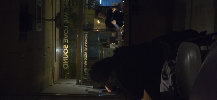 A dimly lit interior shows a dark figure hunched over what appears to be a surface near a storefront window. The window displays mirrored text reading "PICK ME LOVE SOUND." Through the glass, another figure is visible, seemingly behind a counter, possibly serving drinks. Adjacent to the hunched figure, a white chair is partially visible, along with a dark background, suggesting a restaurant or bar setting. The overall tone is subdued and somewhat mysterious due to the low lighting.