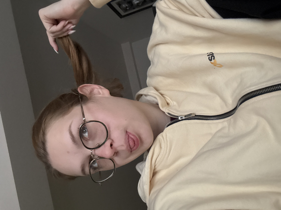 The scene is an indoor, domestic setting located in the city of Kragujevac, Serbia. A young adult female is depicted in a close-up, chest-up shot. She has fair skin, light brown hair pulled back from her face, and is wearing round, gold-rimmed spectacles. Her eyes are directed upwards and slightly to the left (viewer's perspective), and her tongue is partially extended from her mouth. She wears a light yellow or cream-colored hooded sweatshirt with a full-length metal zipper. A dark garment, possibly maroon or black, is visible beneath the zipper. The right side of the sweatshirt features a dark, stylized logo or text, possibly commencing with an orange 'S' or similar character. Her left hand is visible on the right side of the frame, holding a section of her hair. Her fingernails are manicured with a light, possibly glittered or textured, polish. The background is out of focus, revealing a plain light-colored wall on the left and a darker, framed object (possibly a picture or mirror) on the right. No other specific architectural or environmental cues are discernible.
