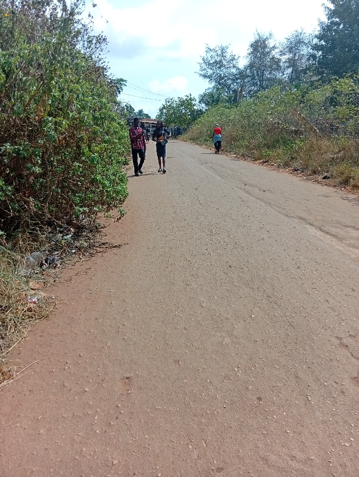An outdoor, daytime scene in Nsukka, Nigeria, features a reddish-brown, unpaved road or heavily worn asphalt surface under a light blue sky with scattered clouds