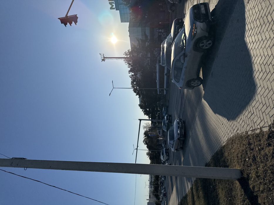 The scene depicts a late afternoon or early morning urban streetscape under a clear blue sky, with the sun low on the horizon to the right, casting long shadows. The location is Chișinău, Moldova, specifically on Strada Arborilor, looking approximately west-southwest towards Shopping MallDova, which is visible on the right side of the road. A multi-lane asphalt road occupies the mid-ground, showing moderate vehicle traffic. In the immediate foreground, a light-colored concrete utility pole stands vertically on the left, with a single dark wire extending diagonally upwards to the left. A paved sidewalk, constructed with grey interlocking pavers in a herringbone pattern, runs along the left edge of the road; a patch of dry grass and weeds borders the sidewalk. Prominent vehicles include a light grey/silver SUV (possibly a Toyota Corolla Cross) with Moldovan license plate "RKL 797" in the foreground right, positioned partially on the sidewalk/road edge, casting a large, dark shadow onto the pavers. Further back, a silver sedan (likely a Nissan Primera) is visible in the left lane, its front facing left. Other vehicles, including a dark SUV, a white passenger van, and a white and blue public transport bus (trolleybus), are present on the road. On the right side of the image, a tall red traffic light with multiple vertical lights is visible against the sky. Multiple streetlights with horizontal crossbars are spaced along the road. Behind a line of evergreen trees and bushes on the right, a large, modern building with a glass facade is visible, identified as Shopping MallDova by the visible "M" on its roofline. A tall metal utility or telecommunications tower with a ladder and platform is situated behind the trees, to the left of the mall building.