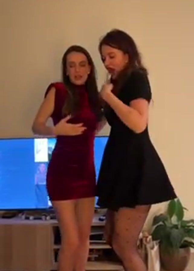 Two women are dancing together in a room. One woman is wearing a short red dress and the other woman is wearing a short black dress and black polka dot tights. They are both barefoot. They are dancing in front of a television and a small plant. The television is on.