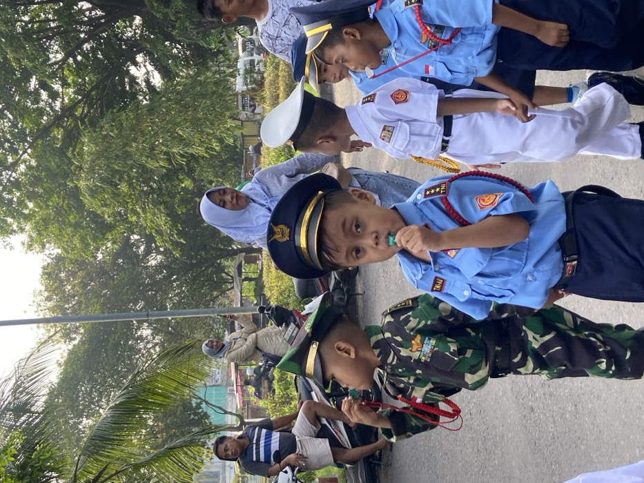 Several children are dressed in military-style costumes, complete with hats and uniforms. They each hold a whistle in their mouths. An adult woman wearing a hijab stands behind them. Other adults sit on motorcycles in the background, observing the children. The setting appears to be outdoors, near a road. Trees and a light pole are also visible.