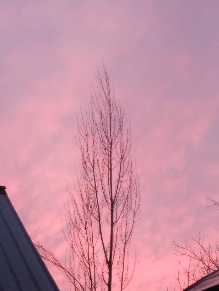 The image depicts a tall, slender deciduous tree, devoid of foliage, silhouetted against a vibrant sky in Гава, Kyrgyzstan. The sky displays extensive hues of pink and lighter purple, characterized by soft, diffused cloud formations, indicating either a sunrise or sunset. The tree occupies the central frame, extending vertically, with its numerous bare branches detailed against the colored sky. A small, dark, irregular object is visible on a branch in the mid-section of the tree. In the lower-left corner, a section of a dark, pitched roof is visible, extending diagonally upwards. A smaller, dark, angled edge of another roof structure is partially visible in the lower-right corner. No human figures or activities are present.