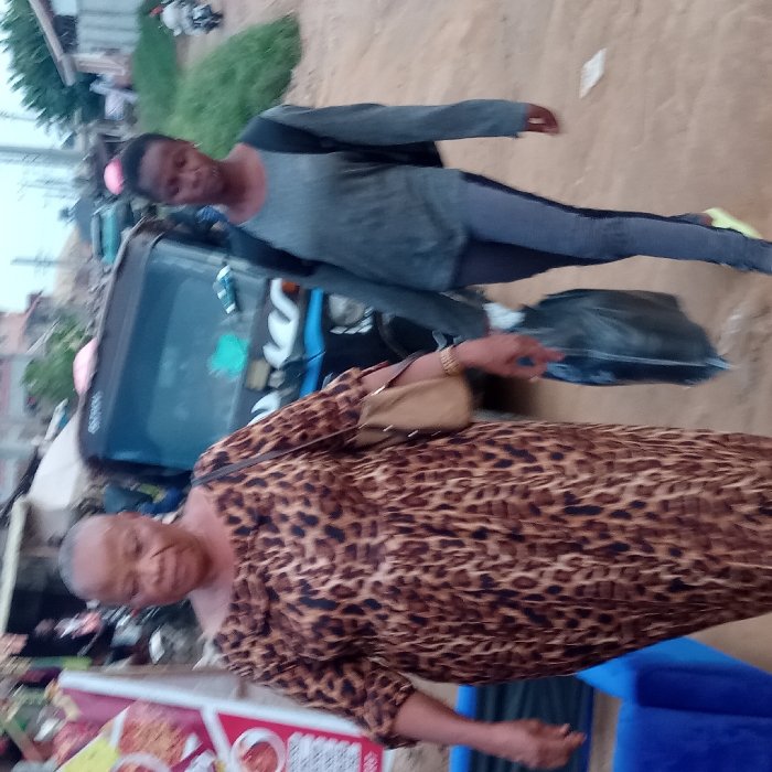 Two individuals walk along an unpaved road in Umuode, Nigeria. In the foreground, an older woman with a bald head wears a brown leopard-print, off-the-shoulder dress, a light brown handbag on her left shoulder, and a gold-colored watch on her left wrist. To her right and slightly behind, a younger woman with short dark hair wears a grey long-sleeved top, dark grey leggings with black side stripes, and neon yellow-green sneakers. She carries a black backpack and a black plastic bag in her right hand. Behind them, a blue and black tricycle (keke Napep) is parked. To the left, a red and white sign displaying food items (rice and stew) is partially visible, along with a blue piece of furniture. The dirt road extends into the background, flanked by buildings and sparse vegetation, with a motorcycle visible further down the road on the right. The sky is overcast.