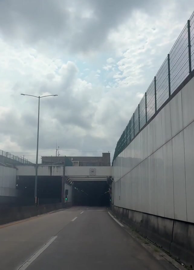 A driver is approaching a dark tunnel entrance on a highway. The weather is overcast, with a sky filled with dark grey clouds. There is a white concrete wall with a green fence running along its top on the right side of the road. A grey concrete wall with a fence runs along the left. Above the tunnel entrance is a sign indicating a speed limit of 60 km/h. Three large ventilation fans are visible inside the tunnel entrance. Green lights are on, indicating that the tunnel is open.