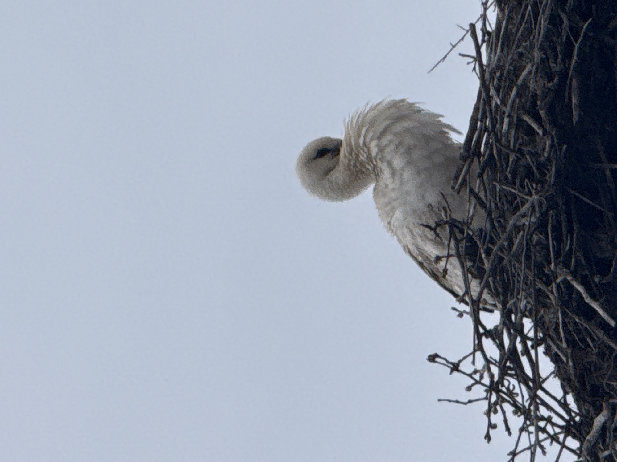 A white stork sits in its nest in Dobrich, Bulgaria. The bird, mostly white with some grey, has its head bent back, preening its feathers. The nest, constructed of dark branches, is situated on a tree. The background is a light grey sky.