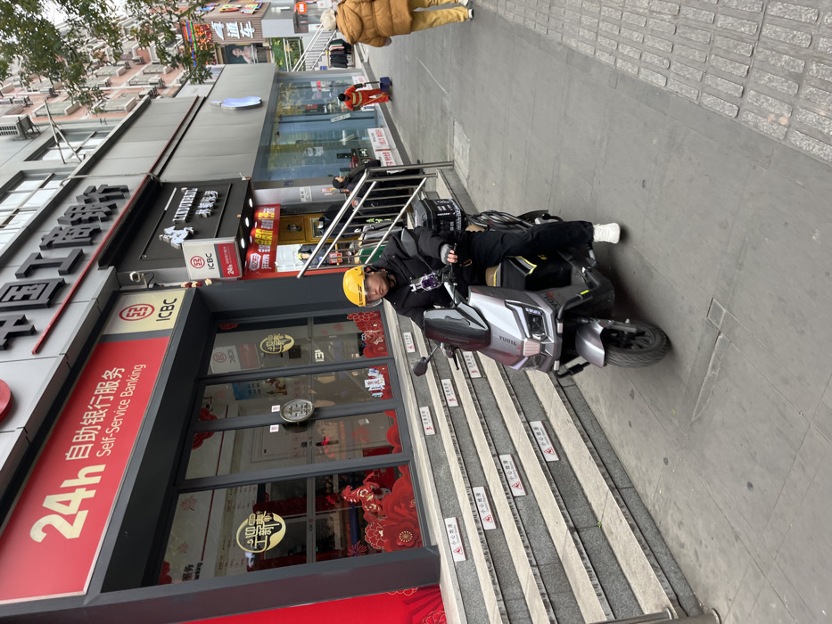 A person with a yellow helmet is on a gray motorcycle parked in front of an ICBC bank. The bank has red signs with white lettering stating "24h Self-Service Banking." Stairs lead up to the bank's entrance. The motorcycle has the word "YODIL" on its front. A person is walking on the sidewalk above the bank. The building beside the bank has a black sign with gold lettering.