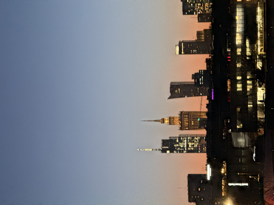 A cityscape at twilight is shown in the image, taken at an unusual, possibly tilted, angle