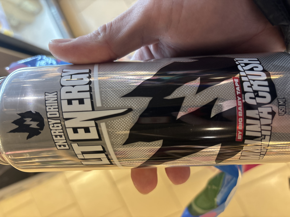 An energy drink can is held vertically by a human hand in an indoor setting within Bugry, Russia. The can, predominantly silver with black and gray accents, features the text "ENERGY DRINK LIT ENERGY" with a flame-like logo above the first line. Below this, large jagged black and silver shapes are visible, followed by smaller text indicating "BY BIG BABY TAPE" in a red box, and then "MALINA CRUSH." The volume "450 mL" is printed near the bottom. The hand, exhibiting light skin tone and visible finger lines, grips the can from the right side, with the thumb visible on the right and other fingers partially obscured on the left. The background is out of focus, showing indistinct shapes and colors, suggesting a commercial environment such as a store aisle or counter.