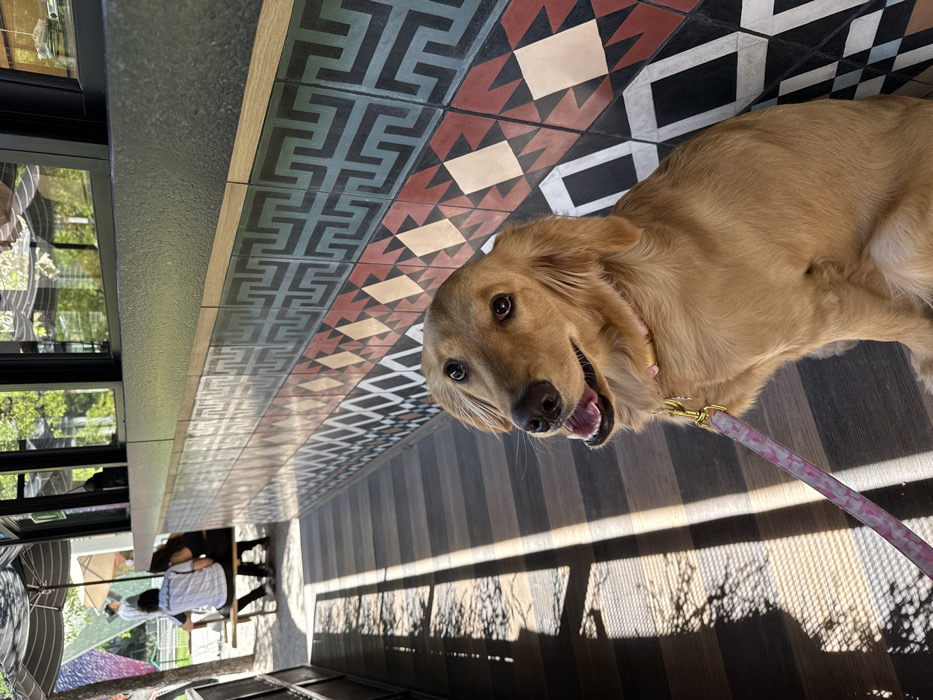 - "A golden retriever dog is depicted seated in the lower right foreground of an outdoor commercial space in San Pedro Garza García, Mexico" by FM-6aVsN2, licensed under CC BY 4.0