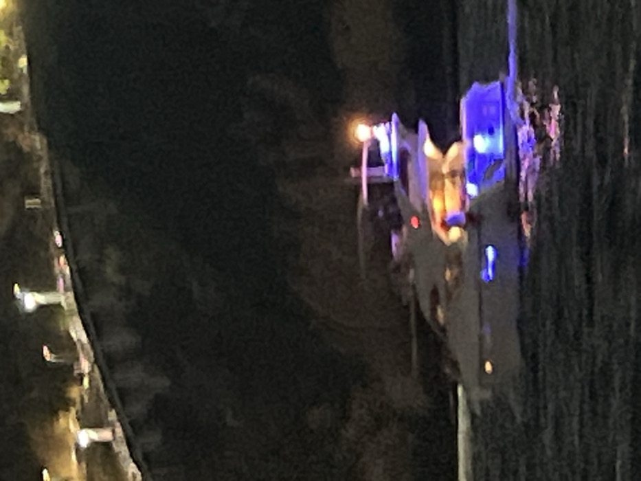 A nighttime photo shows a boat illuminated with blue and orange lights docked near what appears to be the shoreline. People are visible on the boat. A series of lights are on the left side of the image near a dark shoreline. The photo is slightly blurry and the composition is angled.