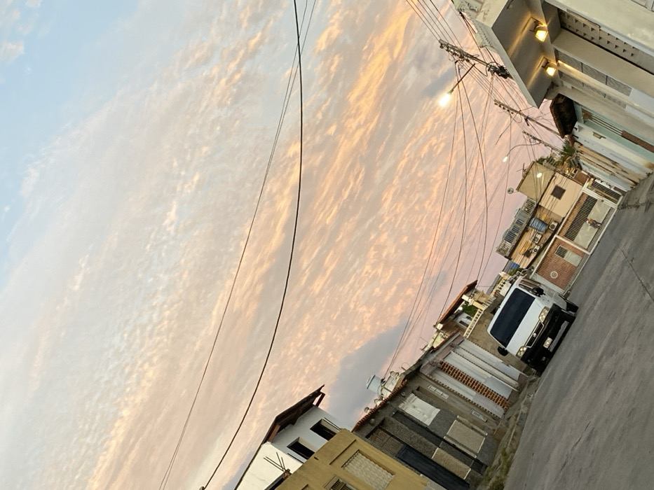 The image depicts an urban street scene in Cotoperíz, Venezuela, during either sunrise or sunset, characterized by a diagonally tilted perspective. The sky occupies the upper two-thirds of the frame, displaying extensive altocumulus clouds tinged with orange, pink, and light blue hues. A paved road, sloping downward from the left foreground to the lower right, runs through the center of the image. On the left side of the street, a continuous line of residential buildings with varied facades is visible. The closest structure features a yellowish exterior with a barred window. Further along, a grey-toned building with brick accents has a white water tank mounted on its roof. A white passenger van or minibus is parked on the street, oriented towards the lower right. A small, indistinct human figure is visible walking on the sidewalk further down the street on the right side. On the right side of the street, more buildings line the roadway. The closest structure exhibits a light-colored facade with a prominent entrance featuring illuminated recessed light fixtures. Overhead, numerous dark utility wires crisscross the sky, emanating from utility poles, one of which supports an illuminated street light fixture.