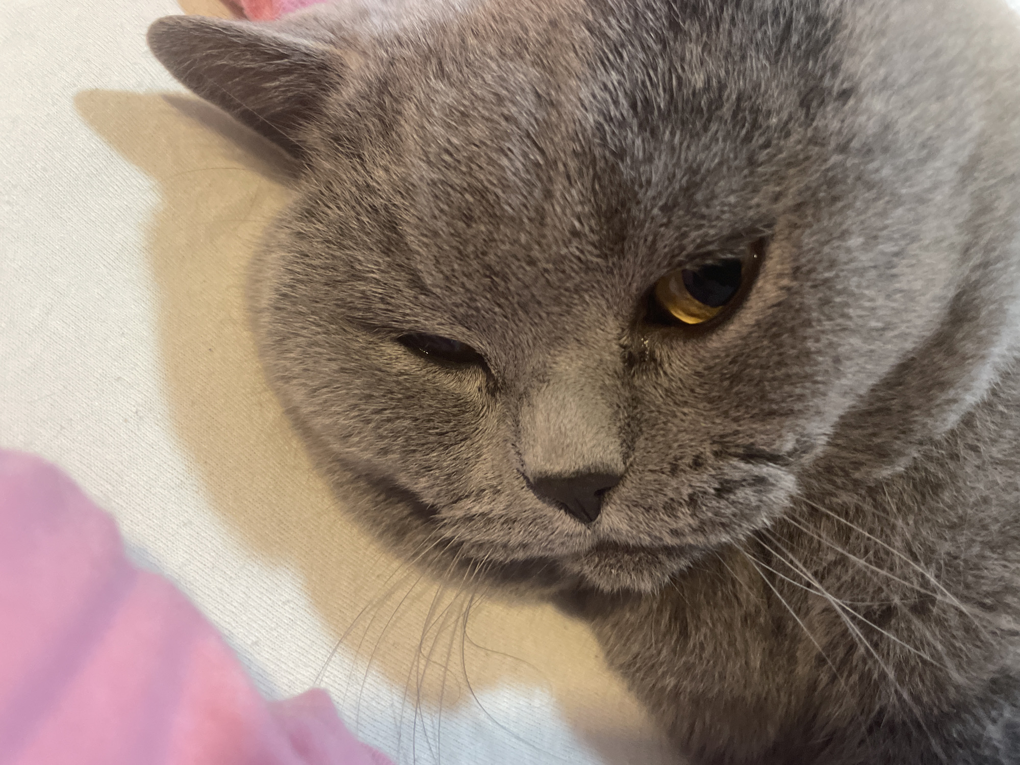 The image displays a close-up, overhead view of a domestic cat's head and partial upper body. The cat has dense, solid grey fur, consistent with breeds such as a British Shorthair. Its right eye, located in the lower right quadrant, features an amber-orange iris surrounding a dilated black pupil. The left eye is partially obscured by fur. A dark, triangular nose and multiple prominent light-colored whiskers are visible on the left side of its face. The cat's head is tilted slightly, and its gaze is directed towards the upper right. The animal is resting on a light-colored, woven fabric surface, likely a blanket or upholstery, which exhibits minor texture and lint. Distinct shadows from the cat's head and ears are cast onto the fabric, indicating a light source originating from the upper left. A blurred segment of pink textile material is discernible in the upper left corner of the frame. The visual evidence within the image is insufficient to determine a specific location within the city of Varna, Bulgaria.