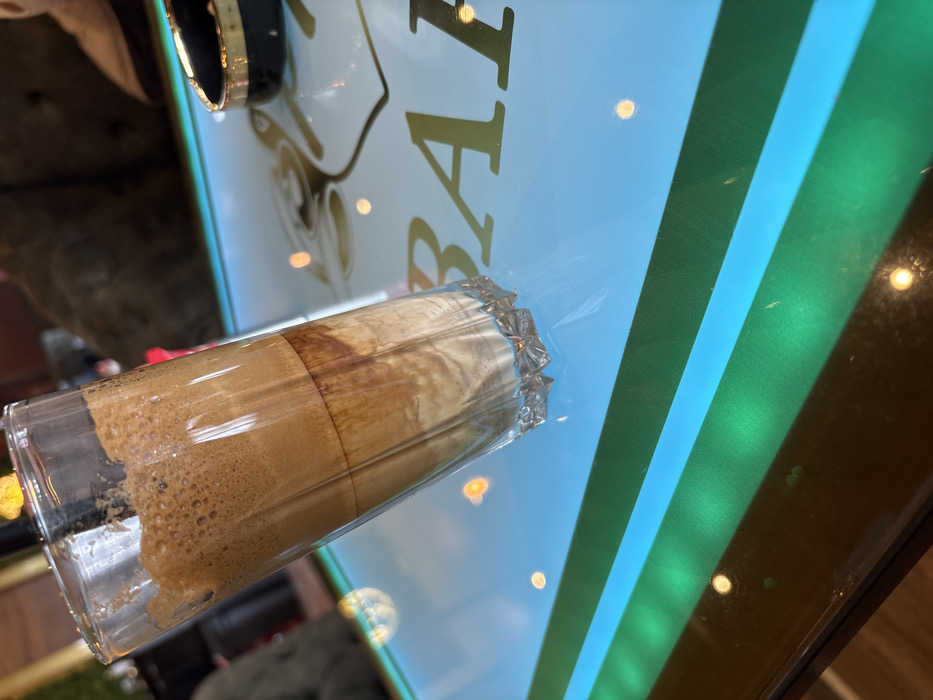 - "The image depicts a tall, clear glass containing a layered beverage, likely a coffee drink, placed on a modern, illuminated table within an unspecified bar or cafe in Ruse, Bulgaria" by FM-U4mdo1, licensed under CC BY 4.0