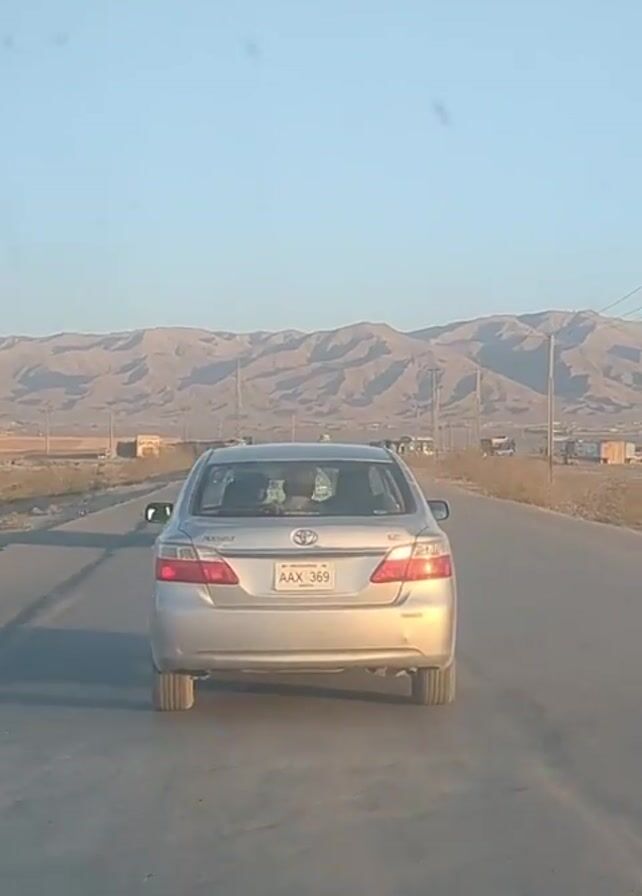 view from inside a moving vehicle on a dusty road in a sparsely populated area. In front of the vehicle, a silver Toyota sedan with license plate "AAX 369" can be seen, followed by a white Toyota Prius with license plate "HCTC 816" and other vehicles further ahead. A motorcyclist wearing a backpack rides on the left side of the road. In the background, there are barren fields, utility poles, and low buildings, with a mountain range visible on the horizon under a clear, light blue sky.