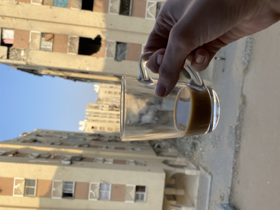 A close-up image shows a light-skinned human hand holding a transparent glass mug containing a small amount of dark brown liquid, approximately 1/5 full, in the foreground. The hand, likely a right hand, exhibits light-colored fingernail polish on the thumb and index finger. The background reveals a wide urban thoroughfare flanked by multiple multi-story residential buildings, primarily light beige or tan in color. These structures exhibit extensive damage, including numerous missing windows, exposed interiors, and significant structural breaches, such as a large irregular hole on the facade of the building to the right. The building on the left features arched ground-level openings. The ground between the buildings appears unpaved, consisting of dirt, sand, and debris. A solitary, small human figure is visible walking on this ground in the mid-distance. The sky above is clear and light blue, indicating fair weather. The scene is illuminated by natural sunlight, casting shadows. The location is an unidentified urban area in Unknown, Unknown, characterized by dilapidated or damaged residential architecture.