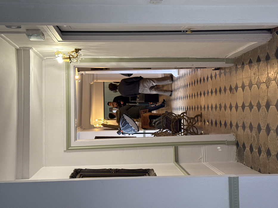 The image depicts an interior view down a corridor within a building in Vexin-sur-Epte, France. The perspective is from a narrower, white-walled area with light green trim on the wainscoting and doorway frame, looking into a wider, more brightly lit space. The floor of the visible corridor is paved with a repeating pattern of light and dark octagonal tiles. On the right side of the foreground doorway, an ornate brass wall sconce with crystal accents and faux candle lights is affixed to the wall. On the left, partially visible, is a dark-framed artwork. Further into the corridor, on the left, an ornate dark-colored bench with an upholstered seat is positioned next to a wooden console table. A professional photography softbox on a stand is set up on or near this table. Approximately four to five individuals are present in the deeper section of the corridor. One person, positioned on the left near the console table, wears a dark jacket with a fur-lined hood and dark pants, appearing to face towards the right. Centrally, another individual is seen holding a violin to their shoulder, facing left. A third individual, with their back mostly to the viewer, wears a dark top and light-colored, loose-fitting trousers. Other figures are partially visible further back in the corridor, which features white pillars or columns. The individuals appear to be congregated, possibly preparing for a session involving music and photography or videography.