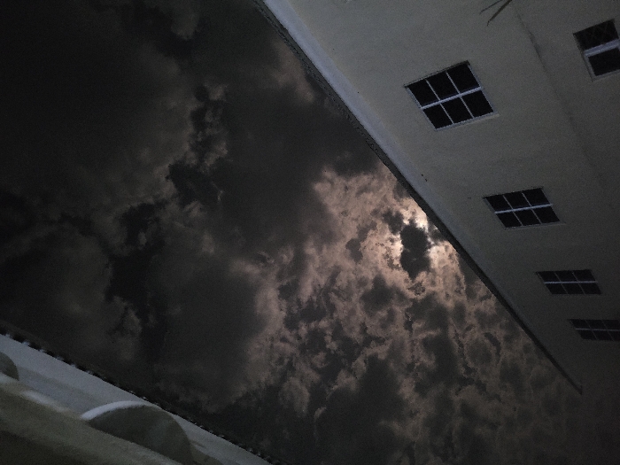A low-angle shot captures a building's side with four visible square windows evenly spaced. The sky fills most of the frame, displaying dark, ominous clouds illuminated by moonlight. The clouds give the image a dramatic and slightly eerie atmosphere. A small portion of a lower structure, possibly a roof, is visible in the bottom left corner. The building and sky dominate the composition.