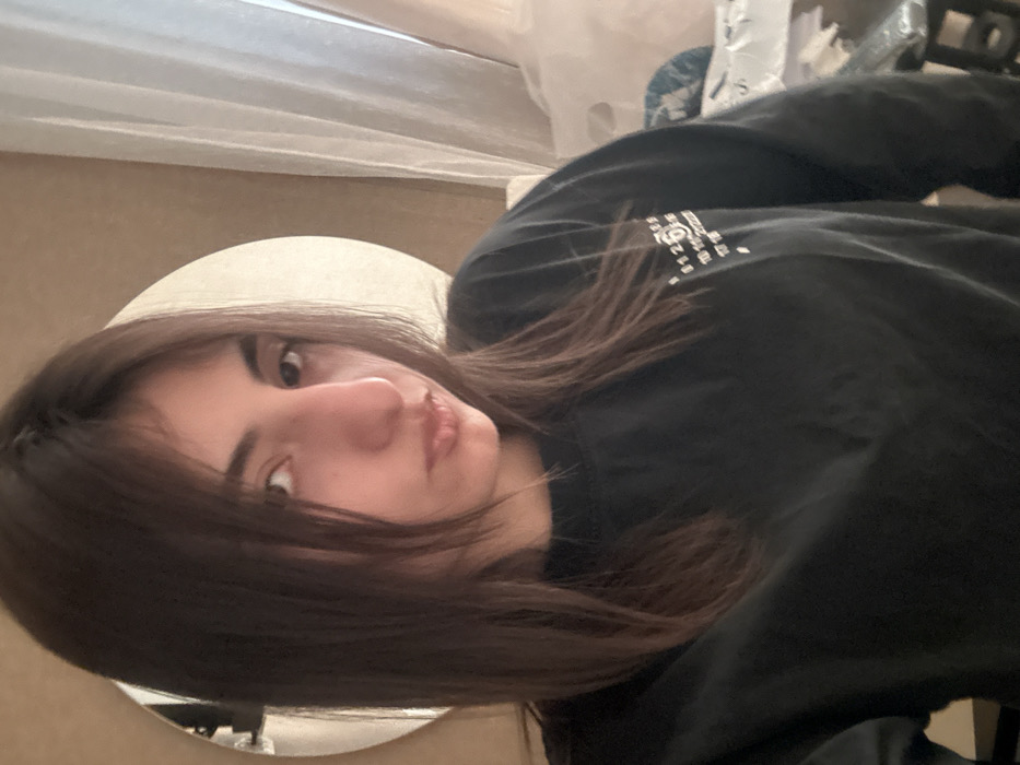 An indoor portrait depicts a female subject from the chest up, positioned slightly off-center to the left. She has medium-long, dark brown hair parted roughly in the middle, framing her face. Her eyes are dark, and her lips are pursed in a slight pout. She possesses a prominent nose. The subject is wearing a black long-sleeved top with white text and numbers visible on the upper right chest area. The background consists of a light-colored wall or surface. A large, circular mirror is partially visible behind the subject's head and to her left. To her right, sheer white curtains are present, suggesting a window. Further to the right and blurred, indistinct items on what appears to be a stool or chair are visible, covered with white material. The subject is directly facing the camera, indicating a self-portrait. The specific location within Tbilisi, Georgia, cannot be determined from the provided image.