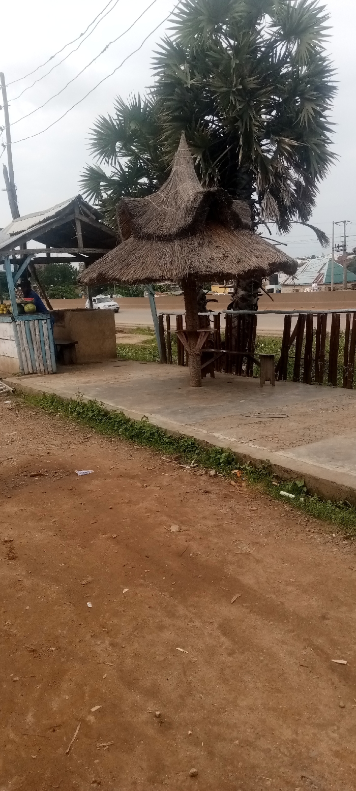 This image captures a roadside scene in Idah, Nigeria, under an overcast sky. The foreground is dominated by reddish-brown dirt, scattered with minor debris and leading to a thin strip of green vegetation. This vegetation borders a light grey concrete slab that serves as a raised pedestrian area. On the left, a rudimentary market stall constructed from wooden planks, some painted blue, and vertical bamboo-like slats, features a weathered corrugated metal roof. Inside this stall, a dark-skinned individual, appearing male and wearing a blue shirt, is seated on a wooden bench behind a counter. The counter displays several fruits, including a large watermelon and multiple green and orange spherical fruits. To the right, a freestanding structure with a multi-tiered, conical thatched roof is supported by a central wooden post. Attached to this post are two small wooden benches and a triangular shelf. A low, barrier-style fence, composed of vertical wooden posts and horizontal rails, extends from this structure to the right, running parallel to the road. Behind these structures, several large palm trees with dense, spiky fronds are prominent. In the mid-ground, a paved road is visible, on which a white sedan is traveling from left to right. Beyond the road, brown earthen structures and distant buildings with green and grey roofs are present. A utility pole with overhead wires is visible in the upper left quadrant of the frame.