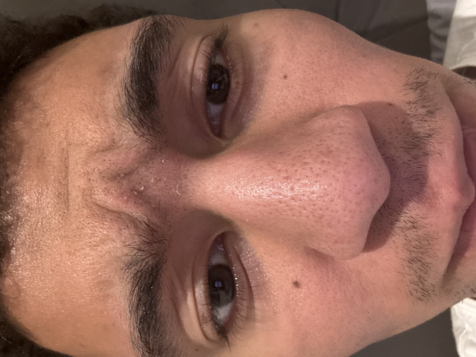 A close-up shot of a man's face, captured from a low angle. His dark brown eyes and thick eyebrows are prominent. The skin displays visible pores, particularly on his nose. There are a few spots and a mole on his face. Some skin flaking is visible near the forehead. The beginnings of a beard are visible on his cheeks. The lighting emphasizes the texture of the skin.