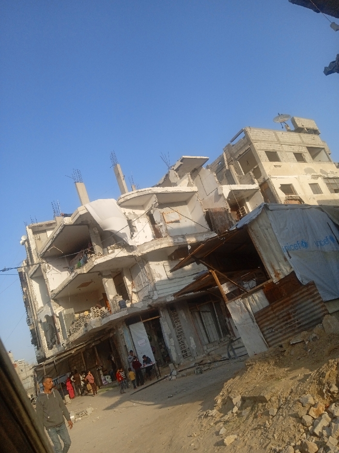 extensive damage to a multi-story building, possibly due to conflict or disaster. Debris litters the ground, and a makeshift shelter or market stall stands adjacent to the ruined structure. People gather near a table with a white banner in front of the damaged building, suggesting a distribution point. The sky is clear, and a man walks in the foreground. The scene evokes a sense of resilience amidst destruction.