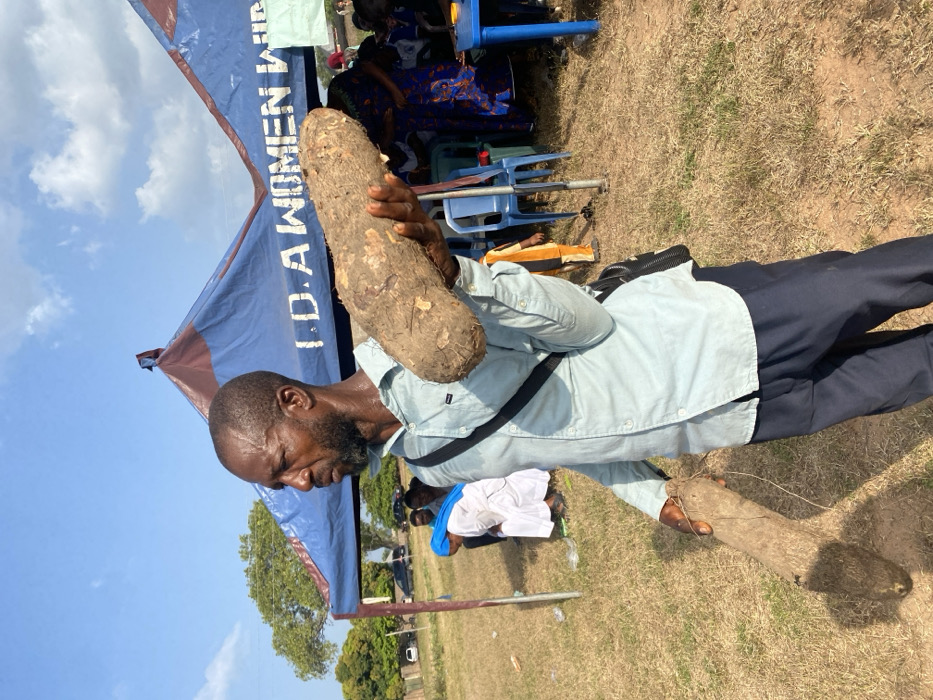 An outdoor scene in Itobe, Nigeria, depicts a dark-skinned adult male of apparent middle age standing centrally, holding two large root vegetables. The man wears a light blue long-sleeved collared shirt, dark blue trousers, and a black shoulder bag. His facial expression is neutral, and his gaze is directed to his left. He holds a large, brown, oblong yam horizontally in his right hand and a longer, thinner, brownish root vertically in his left hand, extending towards the ground. The environment consists of a dry, yellowish-brown grassy field with patches of exposed earth under a clear blue sky with sparse white clouds. In the background, two canopy tents are visible, one predominantly blue with a red/maroon trim and white lettering that reads "I.D. A WOMEN WING". Under and around the tents, several individuals are present, including one person in a white robe and blue head covering seated on the ground to the left, and others partially visible sitting on blue plastic chairs or standing. A blue plastic table is partially visible to the far right. Distant green trees and parked vehicles are discernible on the left side of the background.