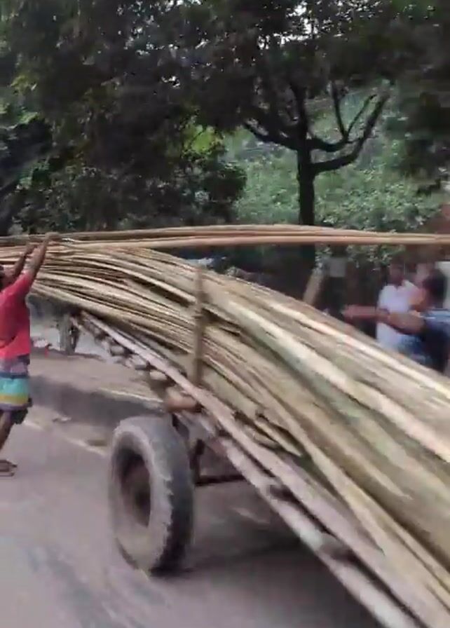 four individuals transporting a large bundle of long, thin wooden poles on a cart along a street. They are moving from left to right in the frame. One individual, wearing a red shirt and patterned skirt, walks ahead, carrying one end of the poles. The other three are pushing and pulling the cart. The cart has one tire and is overloaded with the wooden poles, some of which are dragging on the ground. The street appears to be in a city or suburban area, with green trees lining the side. A concrete barrier separates the street from the sidewalk. In the background, other people and vehicles can be seen. The overall scene depicts manual labor and transportation of materials in a populated area.
